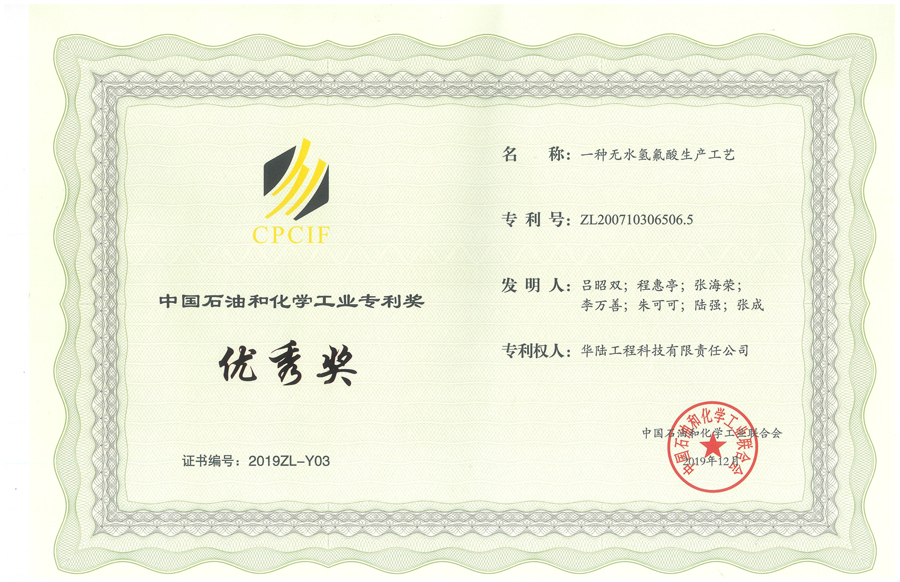 華陸科技“一種無水氫氟酸生產工藝”發明專利喜獲“2019年度中國石油和化學工業專利獎優秀獎”