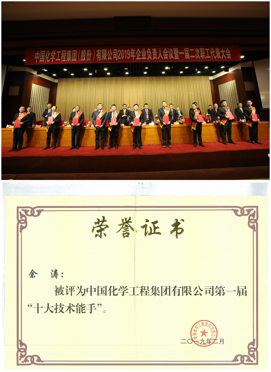 2019年2月14日至15日,中國化學工程集團(股份)有限公司在北京召開2019年企業負責人會議暨一屆二次職工代表大會。會議表彰了首屆“十大創新團隊”“十大技術能手”“十大營銷標兵”“十大杰出青年”,我公司副總工程師、教授級高級工程師余濤獲“十大技術能手”稱號,工藝室主…